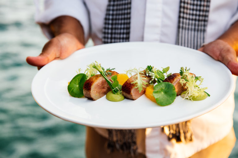 Das Abendessen im Song Saa ist eine Reise durch die einzigartigen Aromen der Region. Eine durchdachte Gourmet-Küche, die traditionelle kambodschanische und internationale Gerichte auffrischt – liebevoll zubereitet und spektakulär vorbereitet.